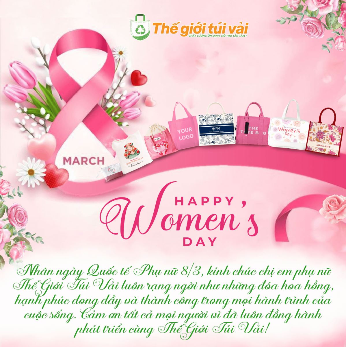 Ngày Quốc tế Phụ nữ 8/3 năm nay tại Thế Giới Túi Vải khép lại với những kỷ niệm đẹp và những nụ cười hạnh phúc. Một lần nữa, chúc tất cả chị em phụ nữ luôn xinh đẹp, rạng rỡ và thành công trong cuộc sống!