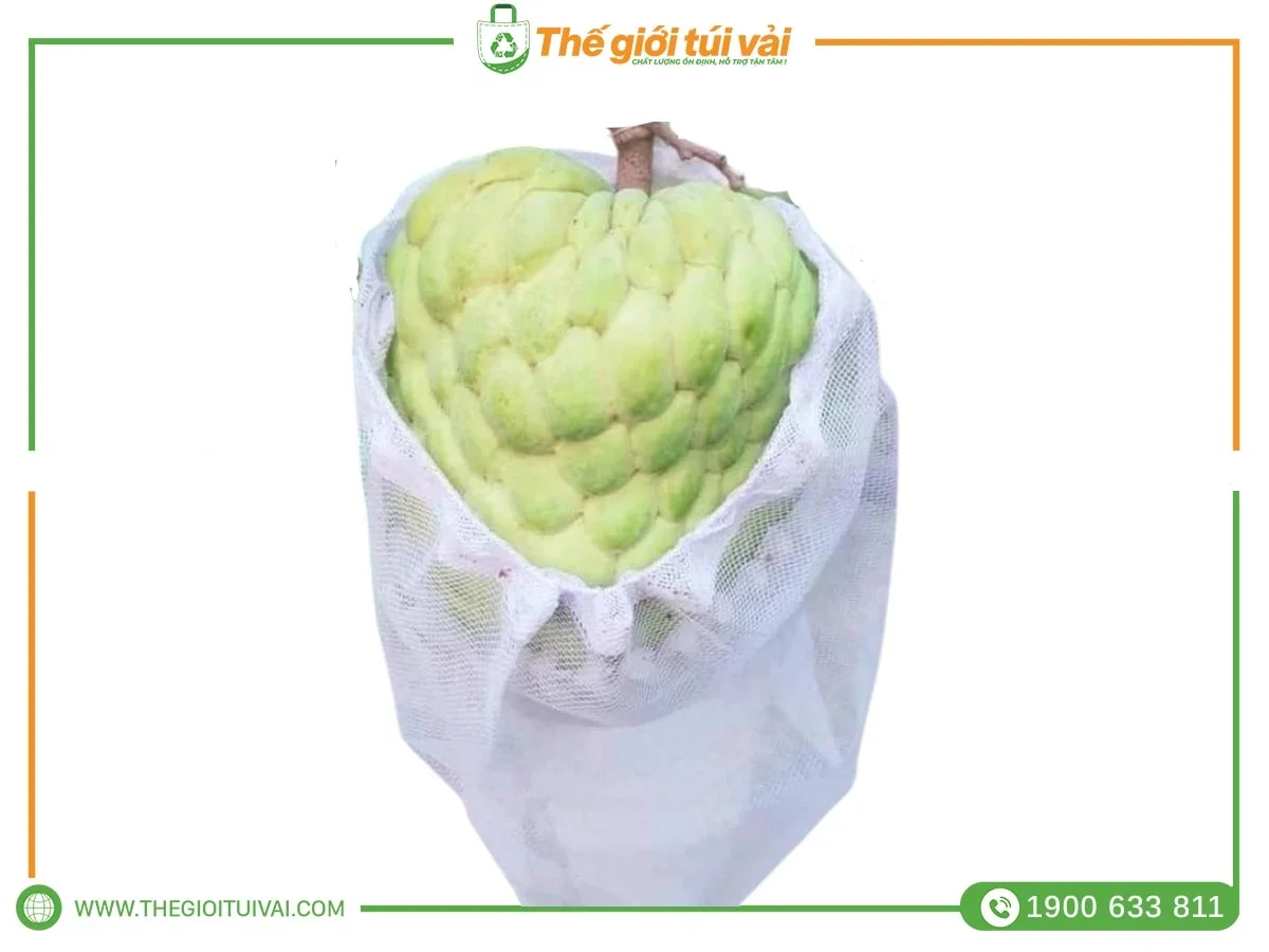 Túi dạng lưới tạo sự thông thoáng, ngăn ngừa ẩm mốc và giúp quả mãng cầu phát triển tốt trong điều kiện tự nhiên.